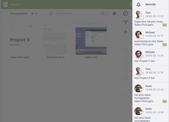 Wer ist Deinem Teamplace beigetreten? Wer hat wann eine Datei herunter- oder hochgeladen? Wurde ein Dokument bearbeitet oder kommentiert? Dank der Aktivitäten-Übersicht in jedem Teamplace bleibst Du immer auf dem Laufenden. Zusätzlich kannst Du ein tägliches E-Mail-Update und Desktop-Benachrichtigungen in deinen Teamplace-Einstellungen aktivieren.