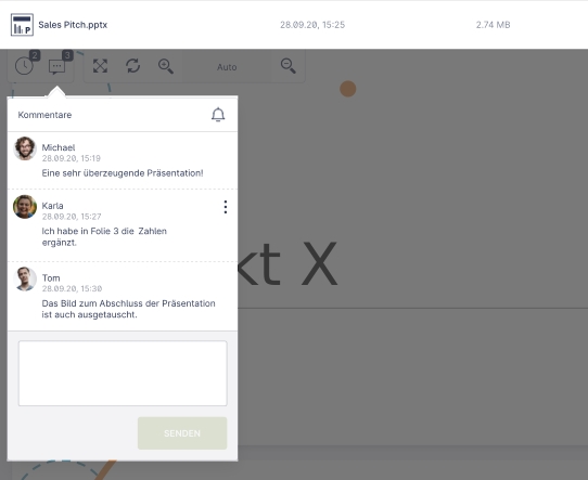 Alle Mitglieder eines Teamplace können – sofern sie mit mehr als Lese-Rechten ausgestattet sind – Dateien nicht nur einsehen, sondern auch kommentieren, bearbeiten und eigene Inhalte hochladen. Dank Office-Integrationen können Word-, Excel- und PowerPoint-Dateien direkt in Teamplace erstellt und editiert werden. So gelingt die gemeinsame Arbeit an geteilten Dateien.