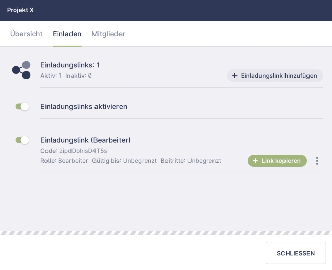 Das Teilen von Dateien funktioniert ganz einfach per Einladungslink. Einfach Link kopieren und per E-Mail, Messenger oder einem anderen Kanal deiner Wahl versenden – und schon können die Empfänger Deinem Teamplace beitreten. Selbstverständlich kannst Du vorab festlegen, welche Rolle und somit Berechtigungen die Empfänger deines Einladungslinks erhalten sollen. Hast Du ein Upgrade gebucht, kannst Du die E-Mail mit der Einladung auch direkt aus Teamplace heraus versenden.