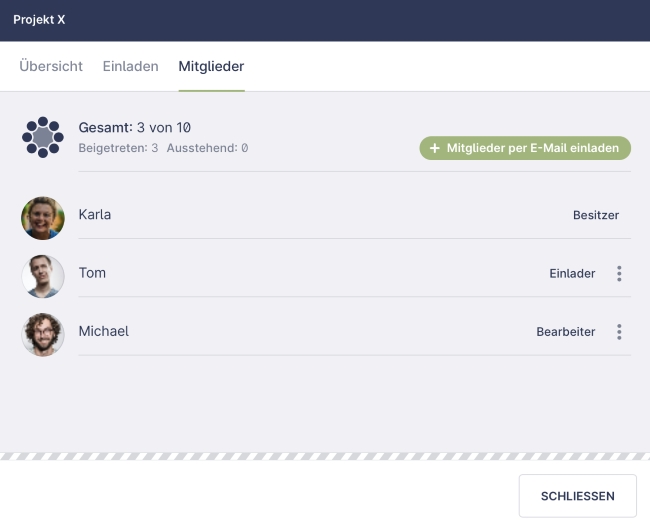 Behalte die Kontrolle darüber, was Andere mit den von Dir geteilten Dateien tun bzw. nicht tun dürfen. Unser Rollensystem macht die Zuweisung und Anpassung von Dateiberechtigungen zum Kinderspiel. Schon beim Einladen kannst Du den Einladungslink mit einer Rolle Deiner Wahl versehen. In der Mitglieder-Verwaltung siehst Du, wer Deinem Teamplace beigetreten ist und kannst die Rolle jedes Einzelnen nach Belieben anpassen.